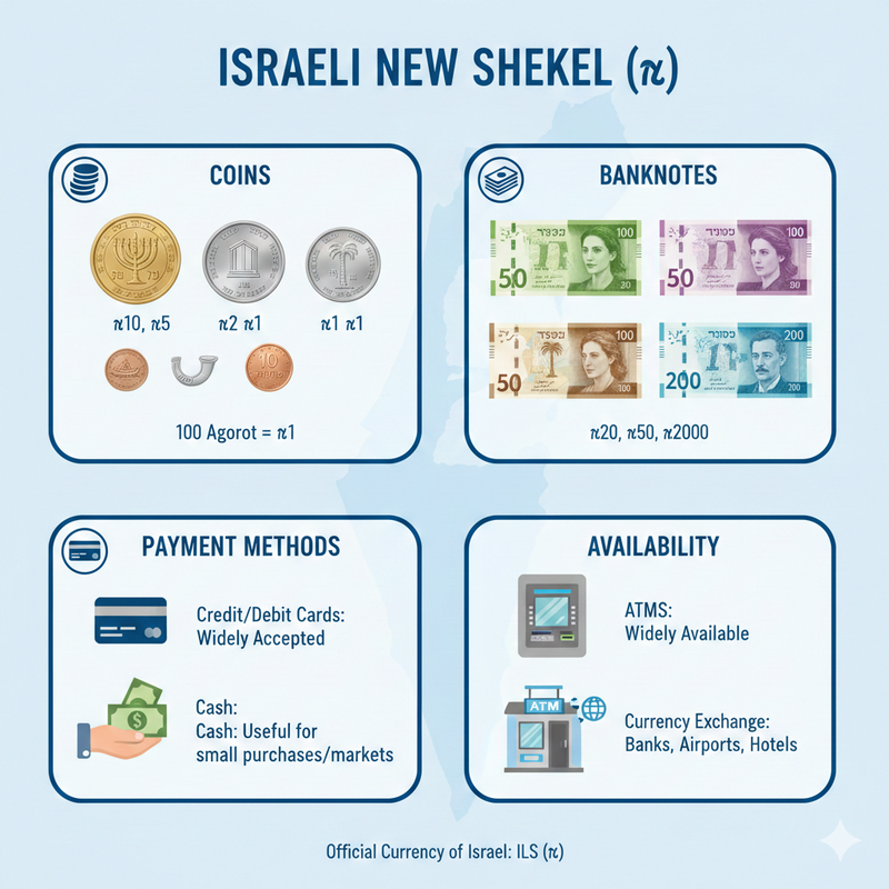 Coins are available in denominations of 10, 5, 2, and 1 shekel, as well as smaller agorot coins (100 agorot = 1 shekel).